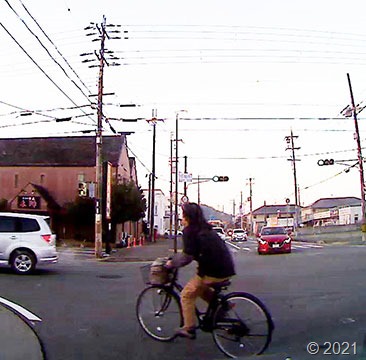 所が、どこからともなく、自転車が現れて前を横切りました。