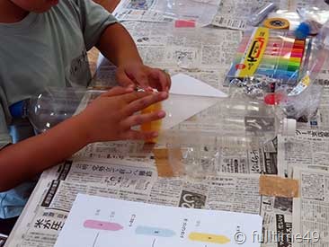 ペットボトルロケット 2023年8月20日 0 投稿者: フルタイム四苦 今日は、青連協の行事でペットボトルロケットを作りました。 1.5リットルの炭酸用ペットボトルを3本使って、繋ぎ合わせます。順番を間違えたら、大変なので要注意。 つなぎ合わせたら、羽を付けたり、色を付けたりしました。 最後に先っぽを取り付けて完成。 出来たら、発射台に乗せて発射実験。 あまり上手に飛ばないのが多かったです。