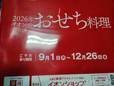 お節のカタログ 2025年9月2日 0 投稿者: フルタイム四苦 仕事から帰ってきて、ポストを見たら郵便が。何かのカタログぽい物が届いていました。 見たら、イオンからのお節のカタログです。早すぎない?。通勤途中で聞いているラジオの番組でも、お節のCMが。去年より、1日早い(笑) 作る方の材料とかの確保もあるのでしょう。もう少し、遅くても良いと思うのですが。
